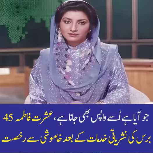 پاکستان کی نشریاتی تاریخ کی ایک درخشاں آواز عشرت فاطمہ نے تقریباً 45 برس تک ریڈیو اور ٹیلی وژن سے وابستگی کے بعد خاموشی سے اپنی ذمہ داریوں کو خیرباد کہہ دیا ہے۔