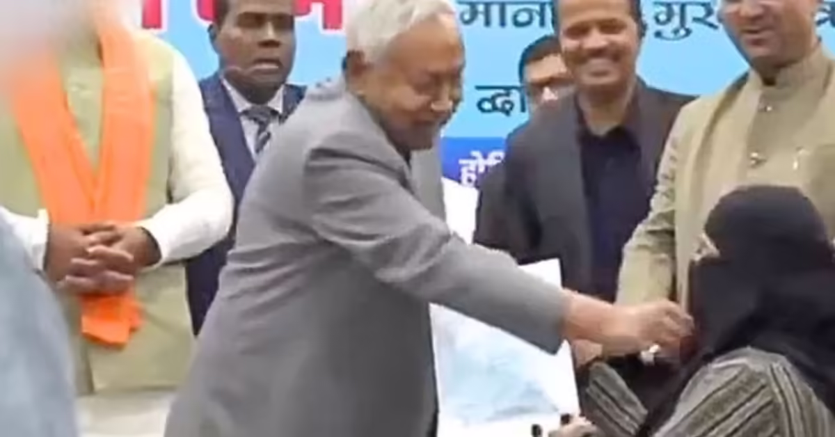 Just IN:— Indian Chief Minister Nitish Kumar forcibly pulls down the veil of a Muslim woman doctor while handing out appointment letter in a ceremony. pic.twitter.com/SCEeX6PCEc