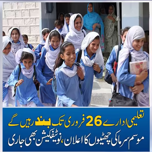 نوٹیفکیشن کے مطابق سرد علاقوں کے تعلیمی اداروں کے لیے سرمائی تعطیلات 26 دسمبر 2025 سے 26 فروری 2026 تک ہوں گی جبکہ سرد علاقوں کے تعلیمی ادارے مجموعی طور پر 63 روز تک بند رہیں گے۔